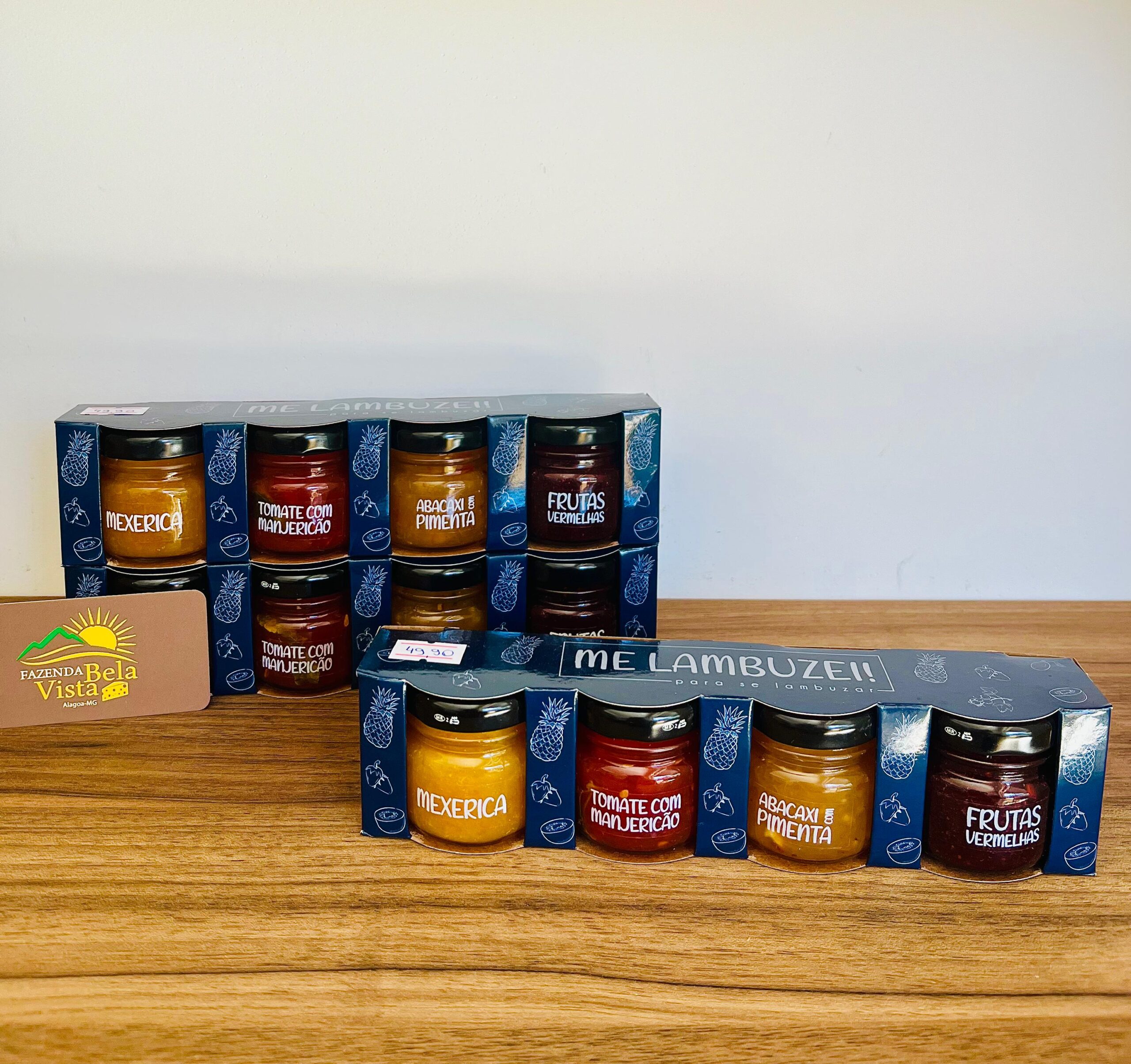 Descrição: Kit com quatro minis geleias artesanais, nos sabores: Mexerica, Tomate com Manjericão, Abacaxi com Pimenta, e Frutas Vermelhas. Vocês não estão preparados para tanta gostosura em um mini kit!